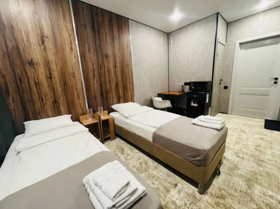 Стильный номер с современным дизайном содержит в себе все самое необходимое: спринг-боксы, которые можно формировать, как одну двуспальную или две односпальных кровати, шкаф, прикроватные столики, телевизор, собственную ванную комнату и комплект полотенец.